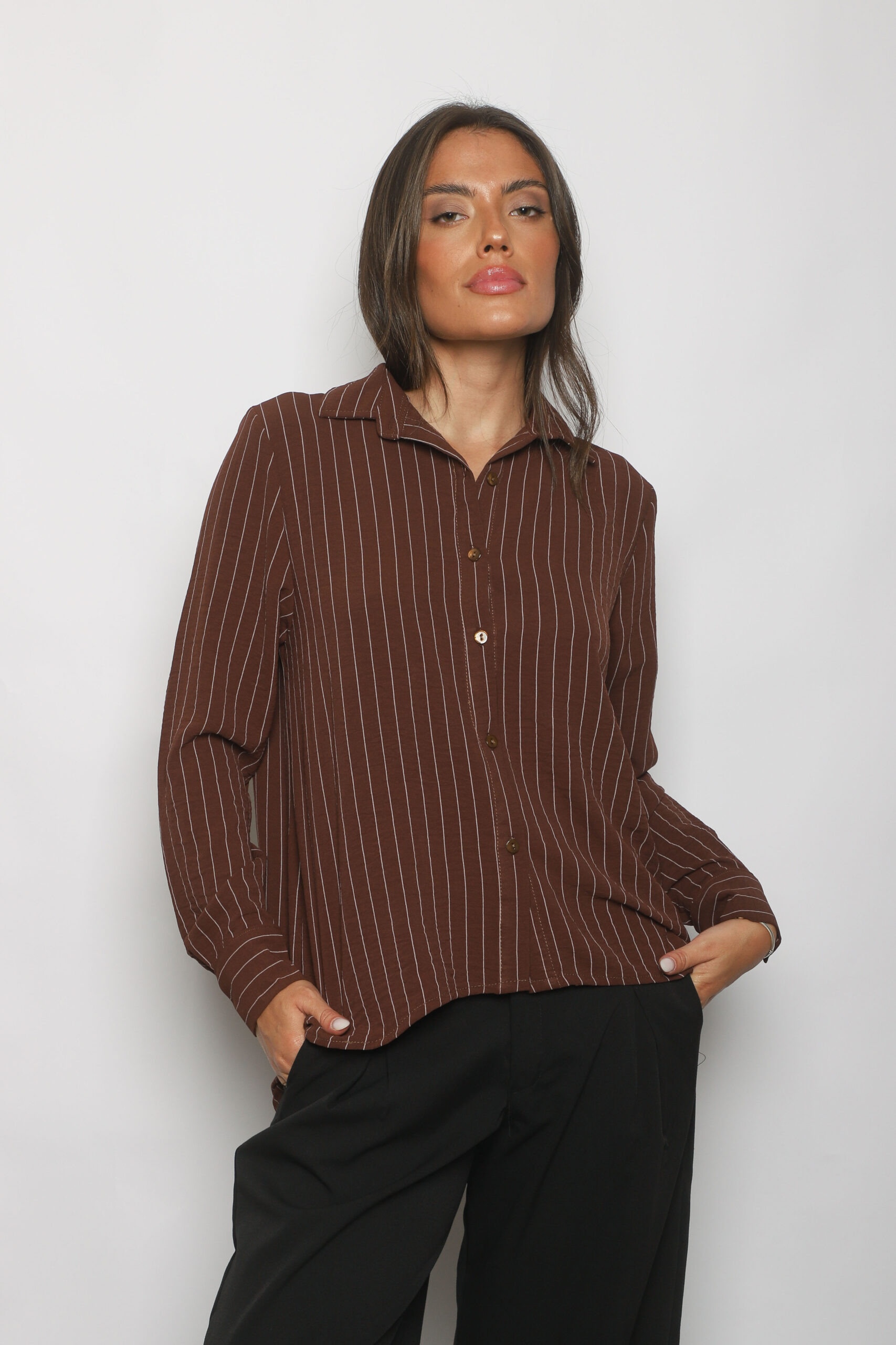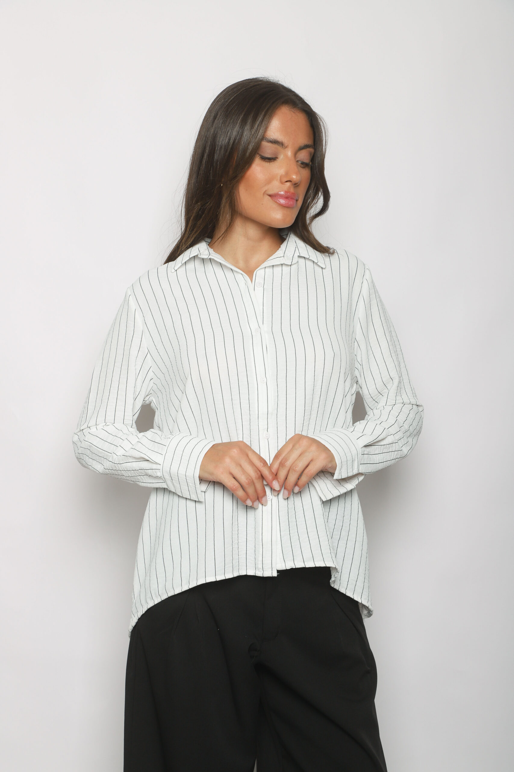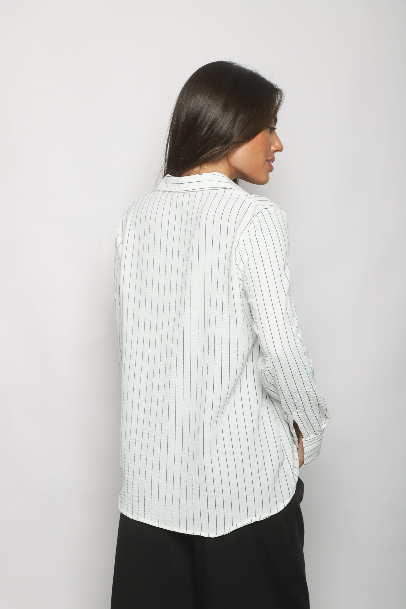 Descripción: Camisa básica a rayas, con terminación redondeada y puños anchos con dos botones.