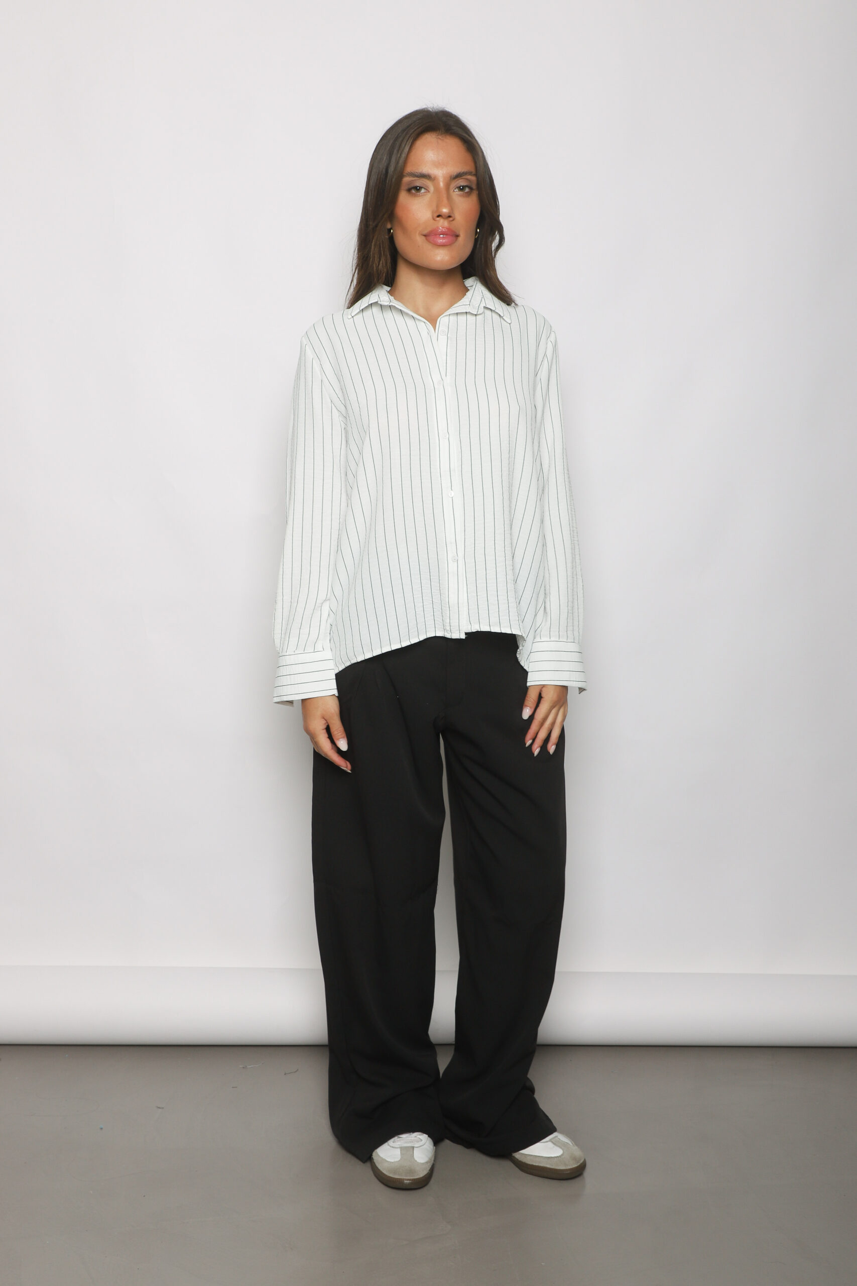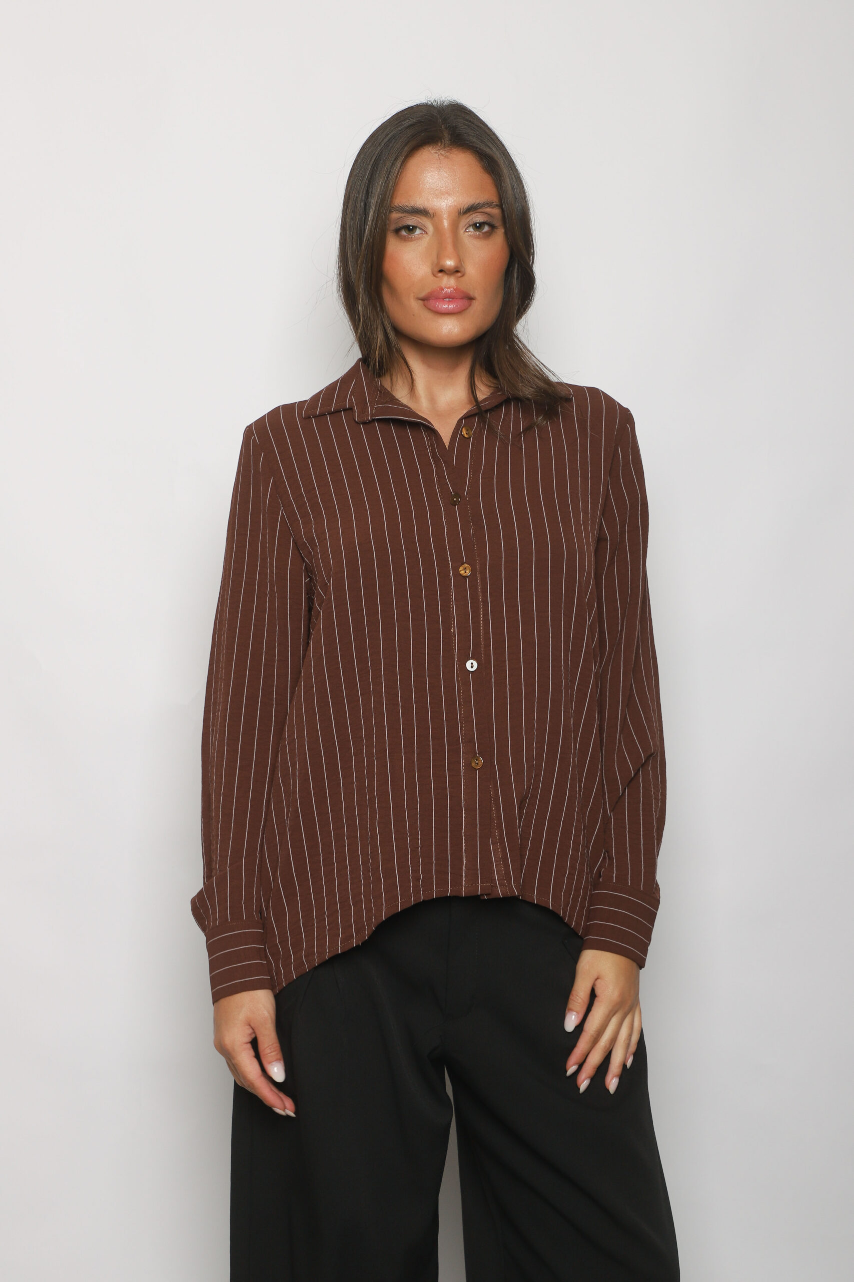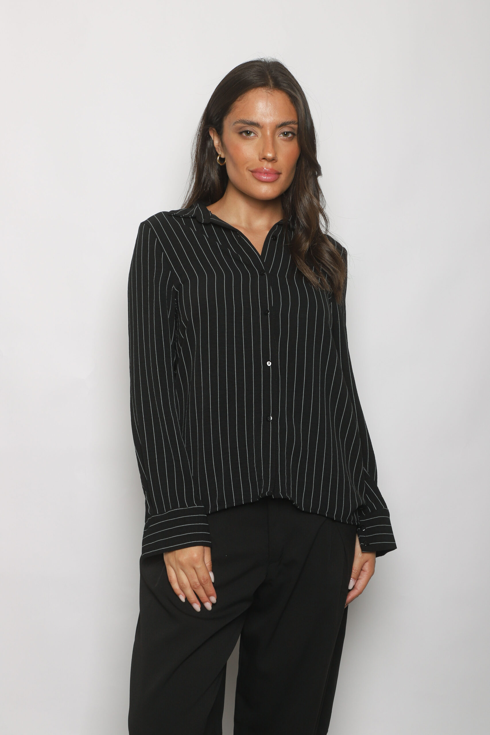 Descripción: Camisa básica a rayas, con terminación redondeada y puños anchos con dos botones.