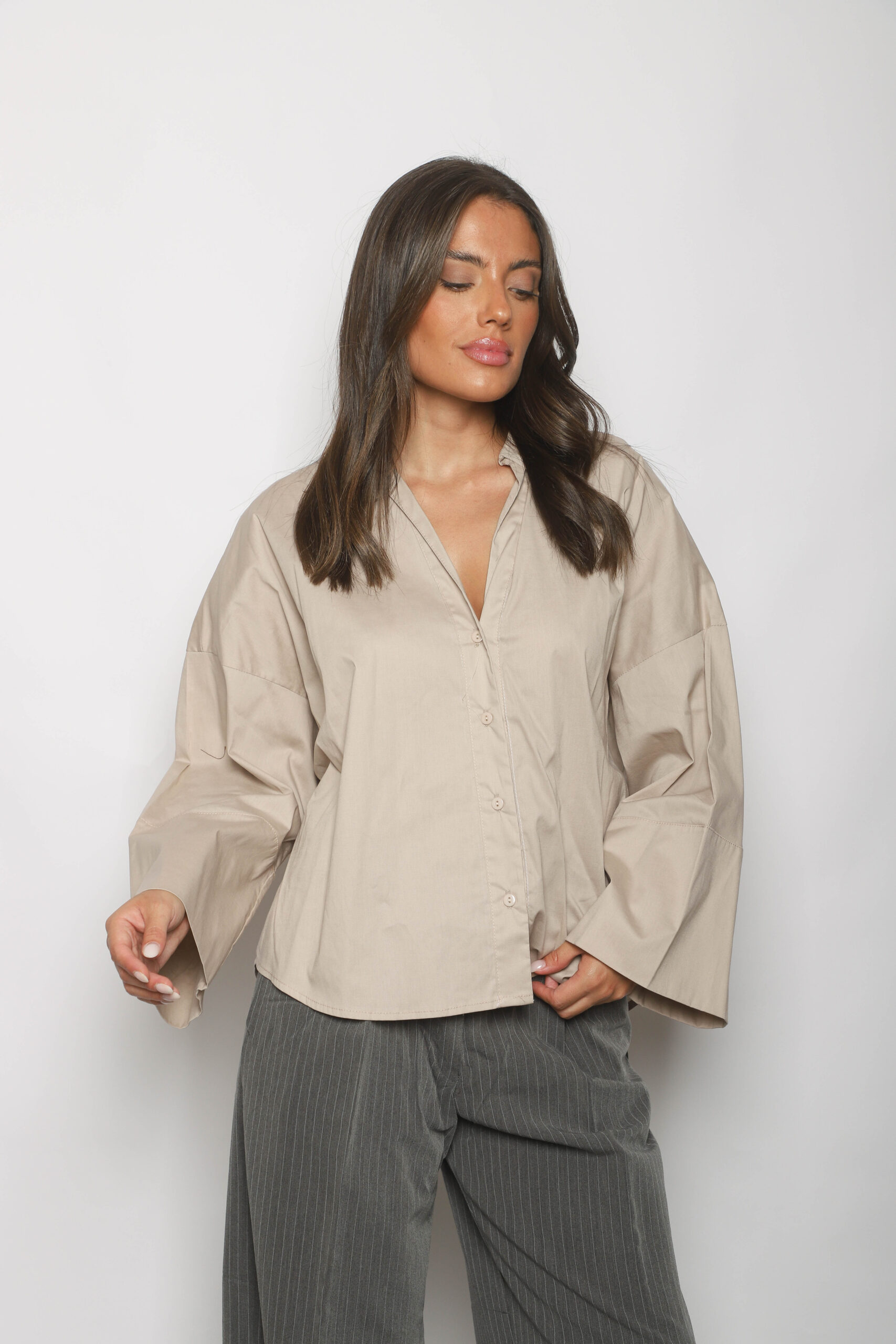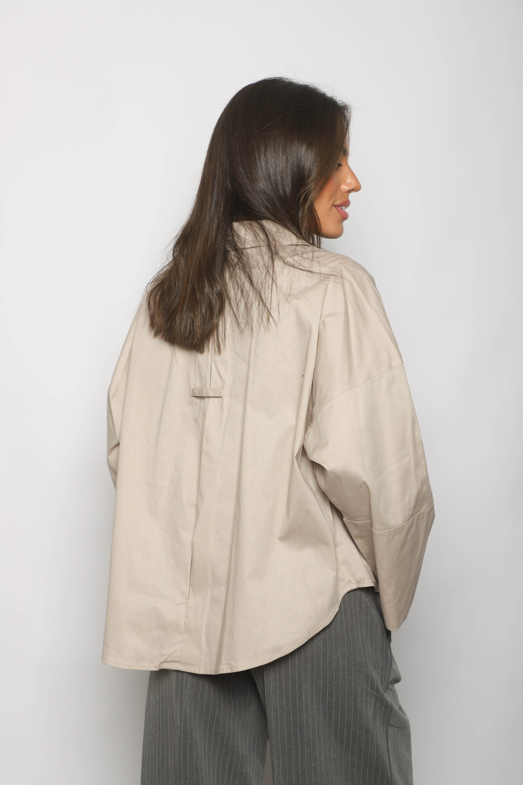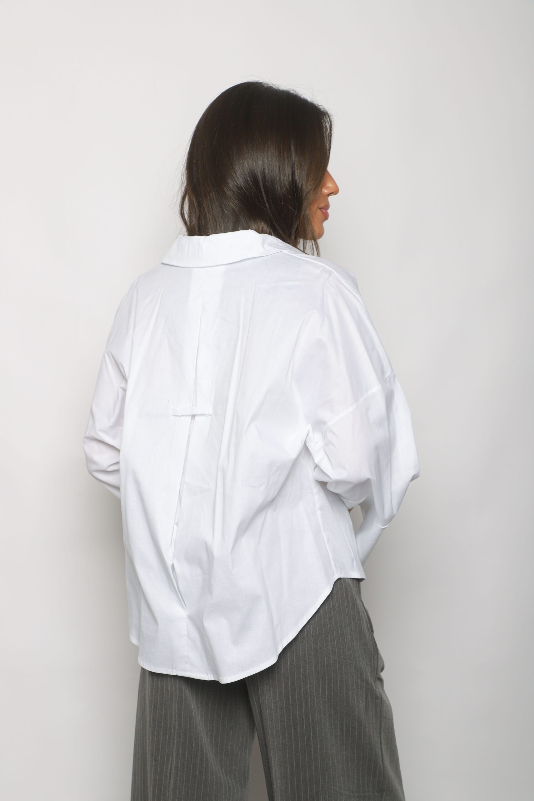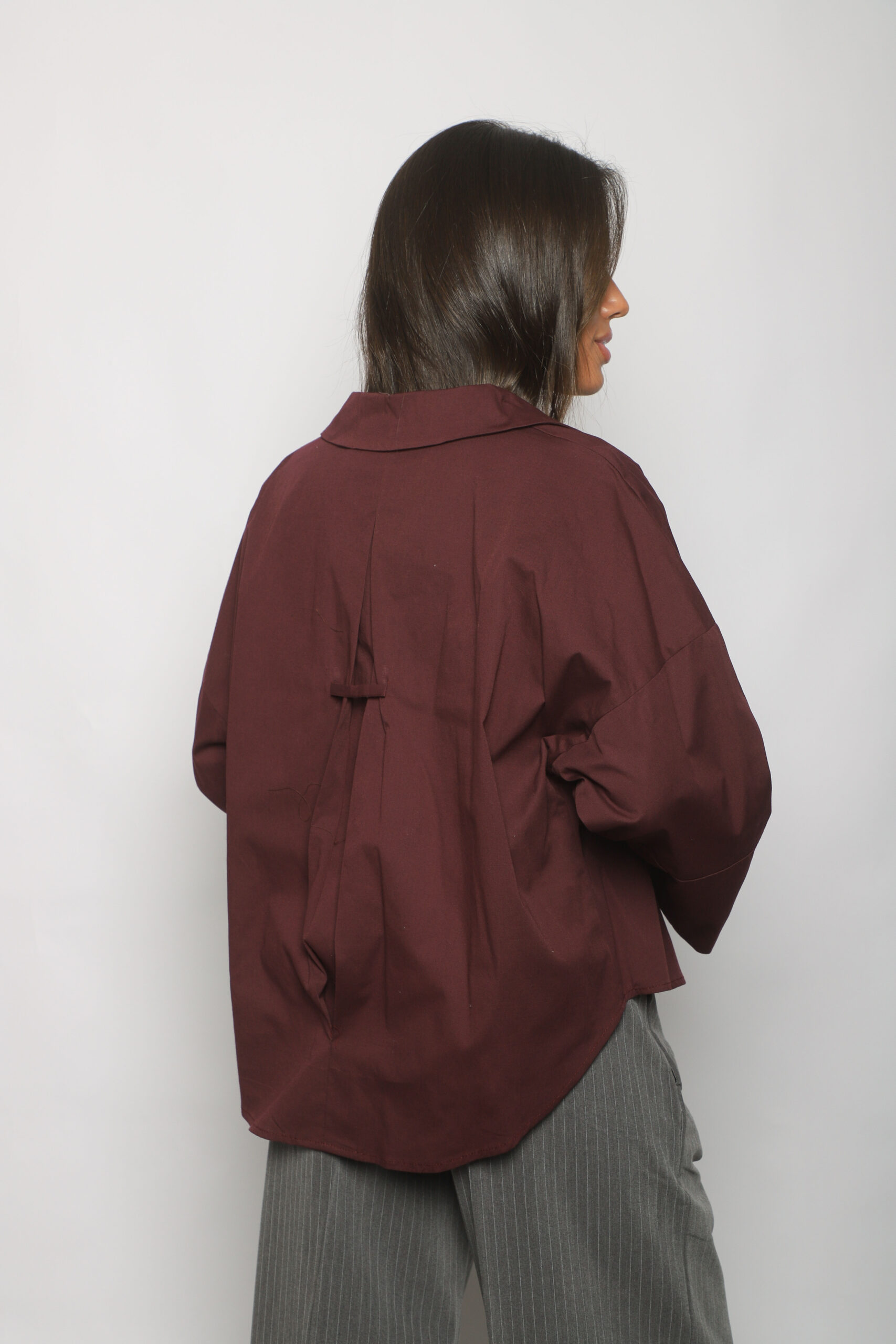 Descripci贸n: Camisa oversized con corte a la cadera y escote en V, tiene mangas anchas y detalle en la espalda de una tabla confeccionada para adentro en todo el largo y una tirita uniendo ambos lados.