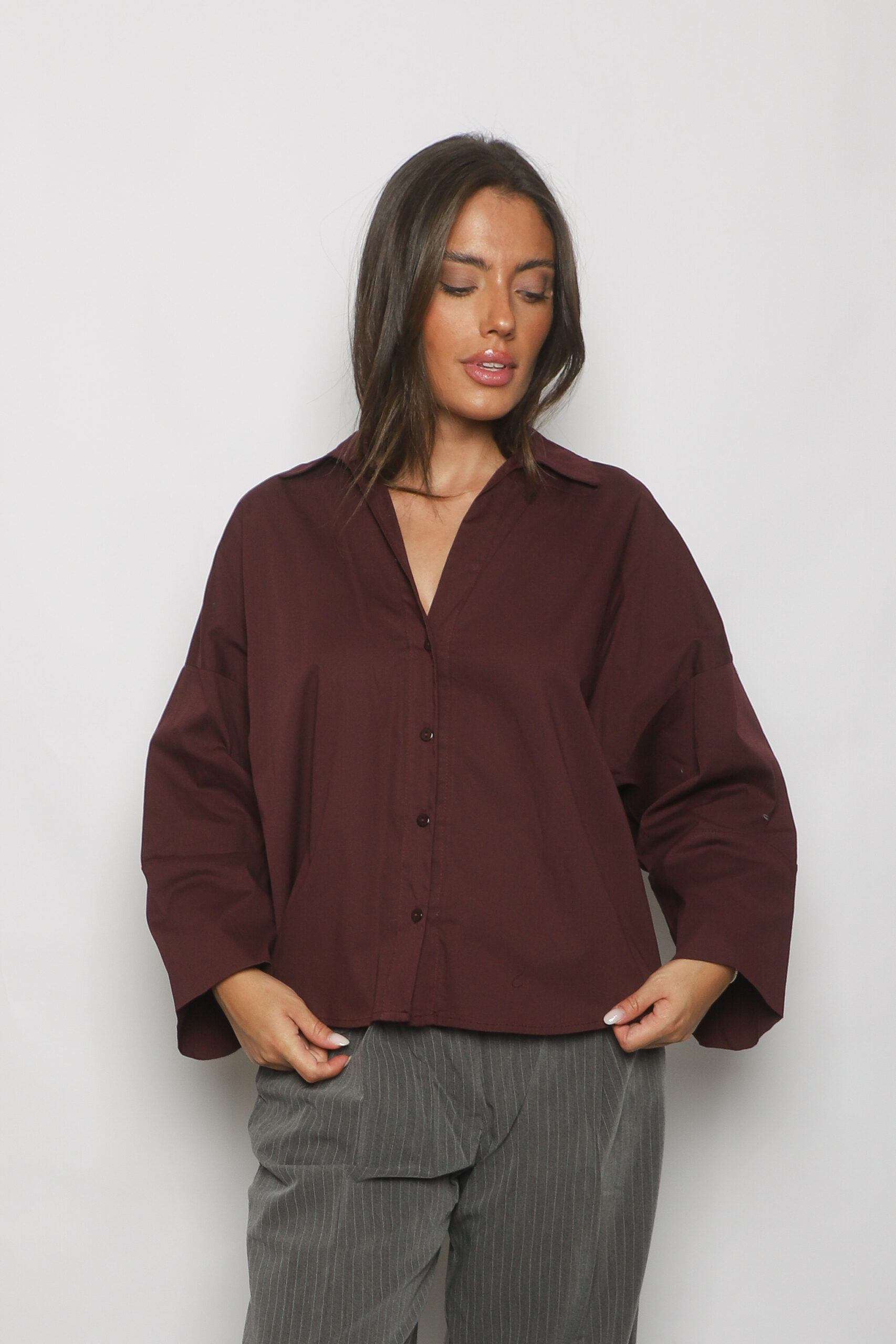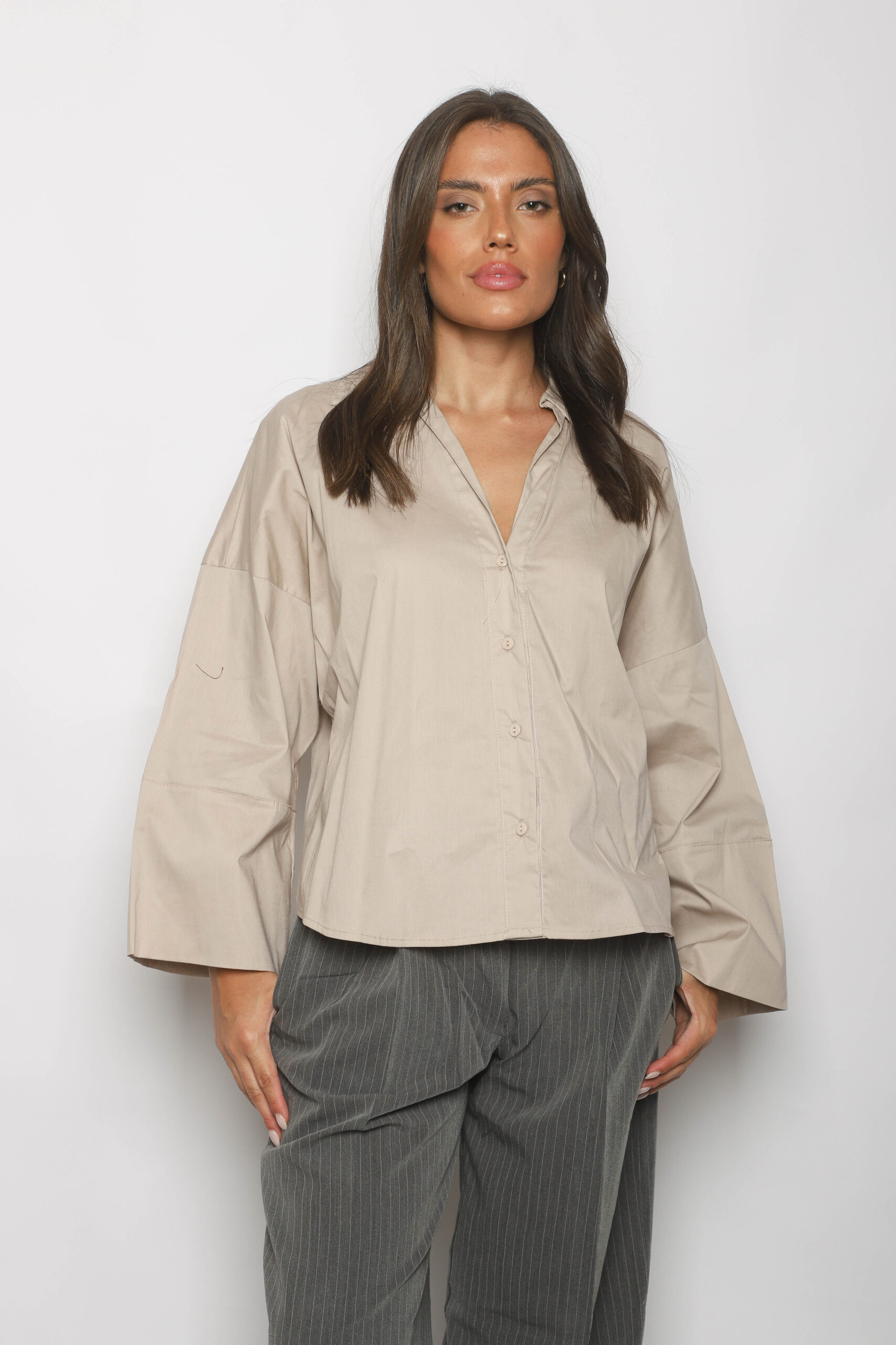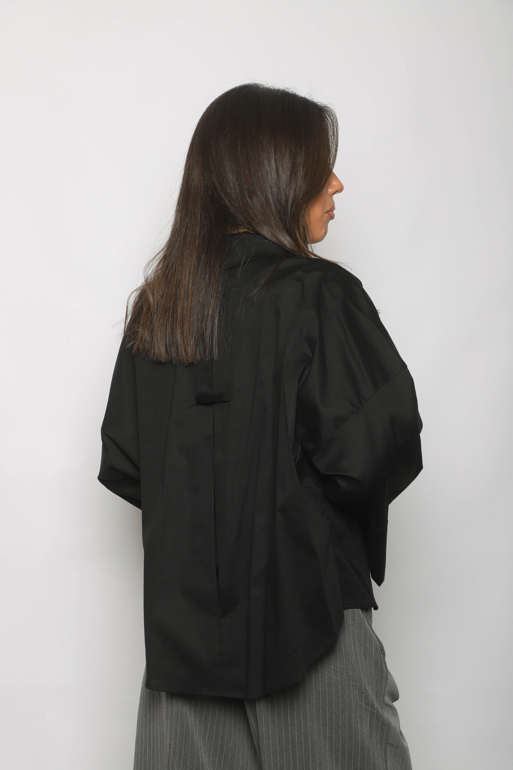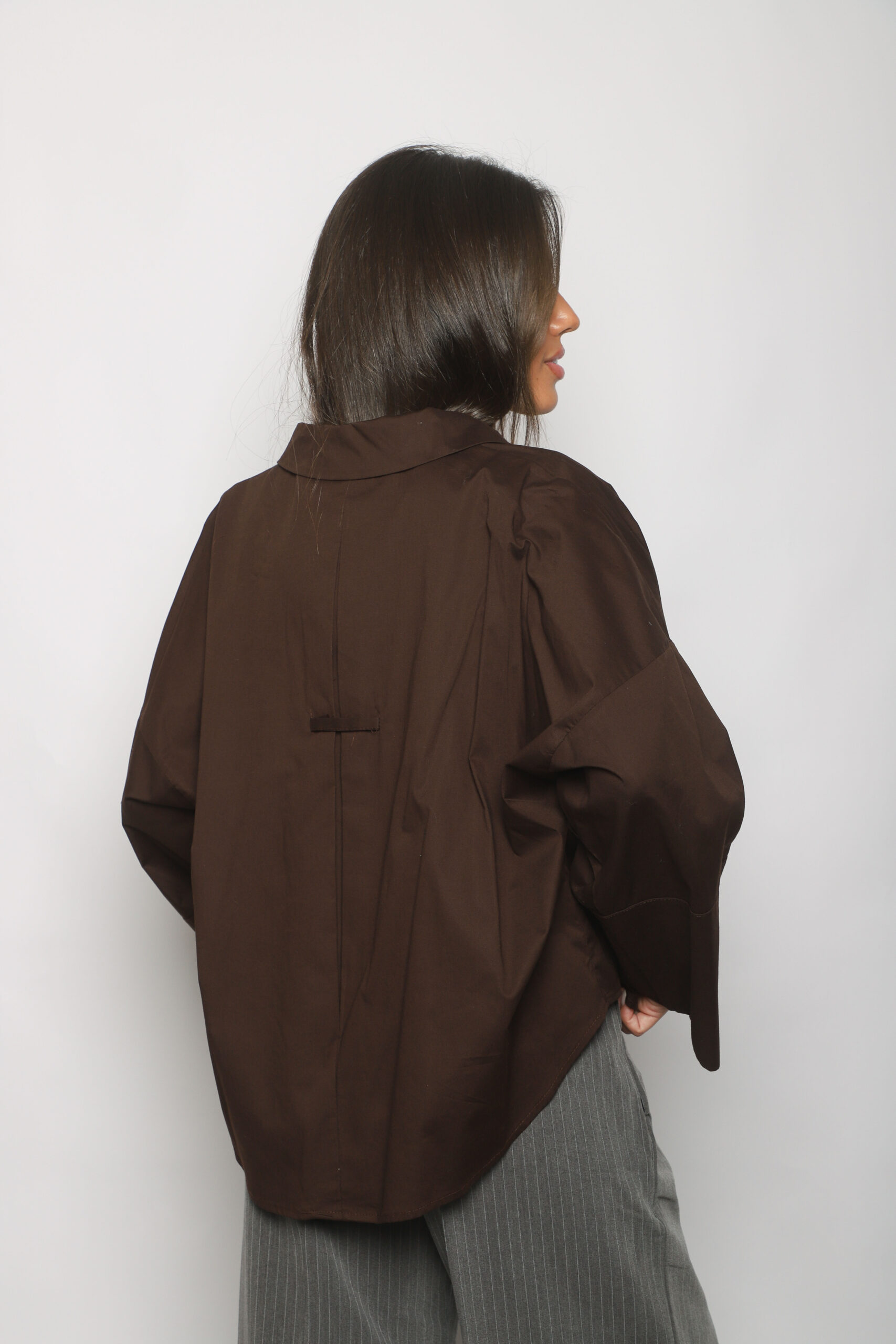 Descripci贸n: Camisa oversized con corte a la cadera y escote en V, tiene mangas anchas y detalle en la espalda de una tabla confeccionada para adentro en todo el largo y una tirita uniendo ambos lados.