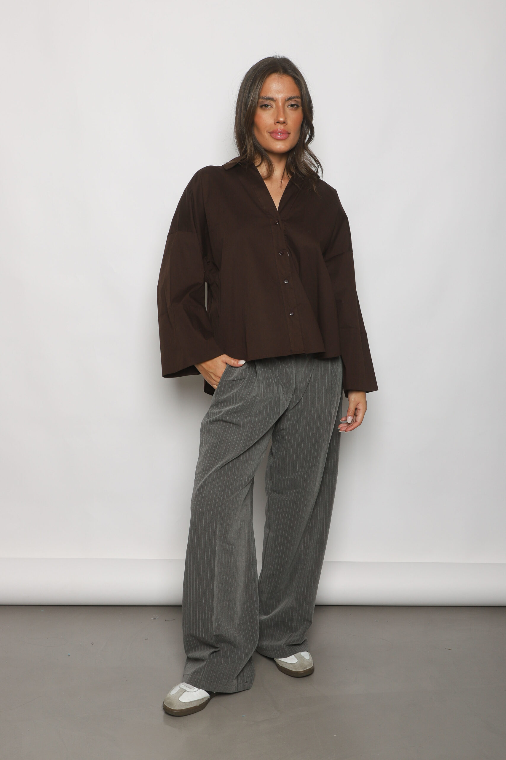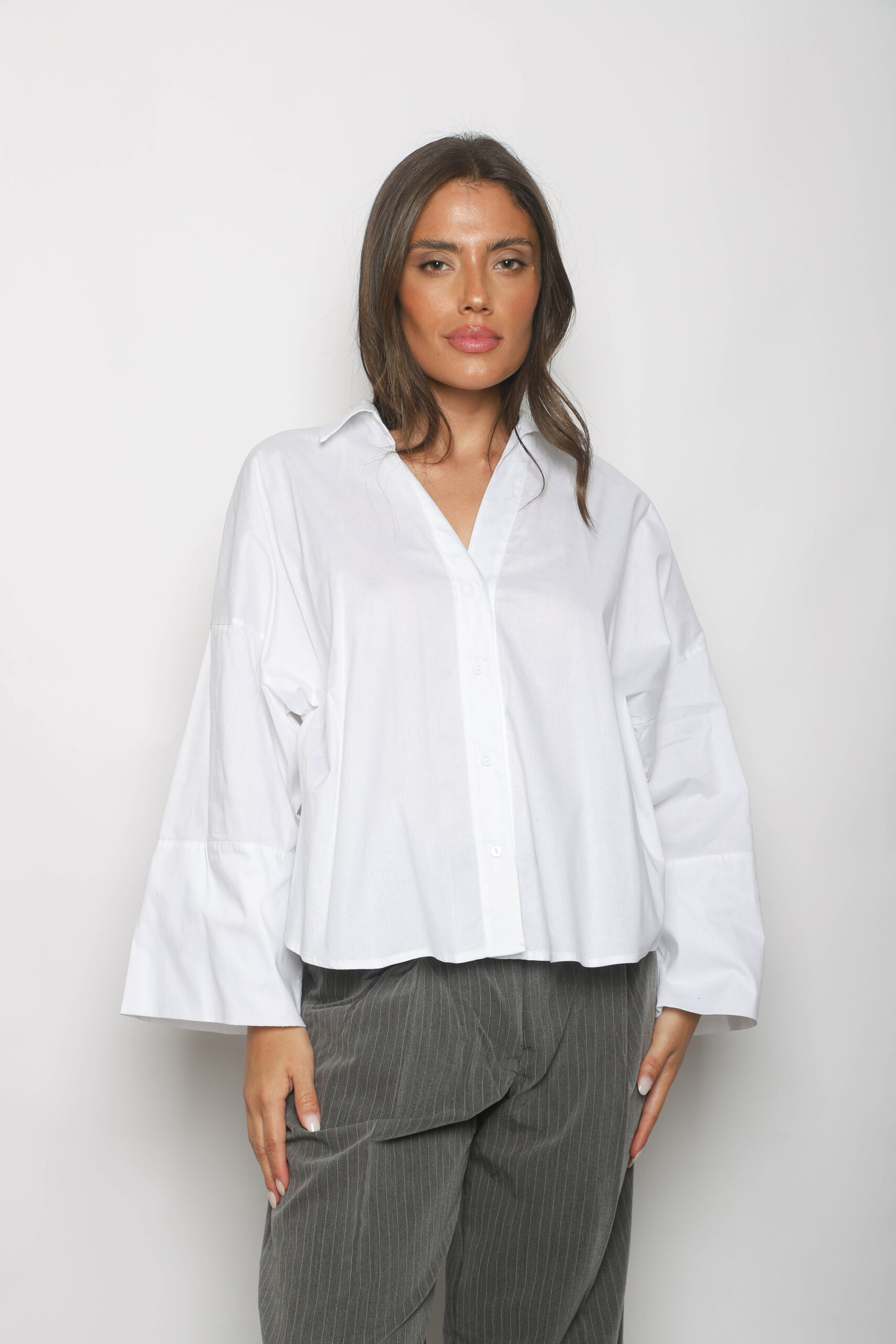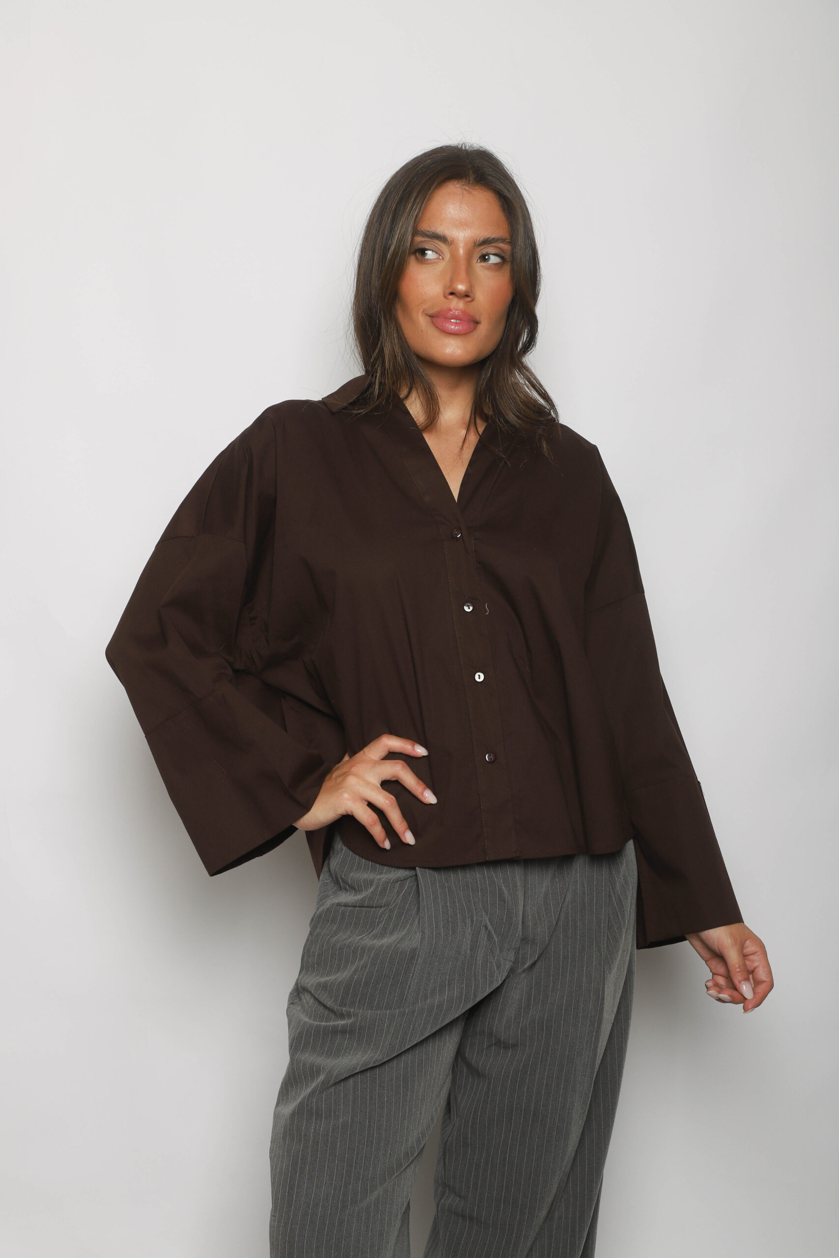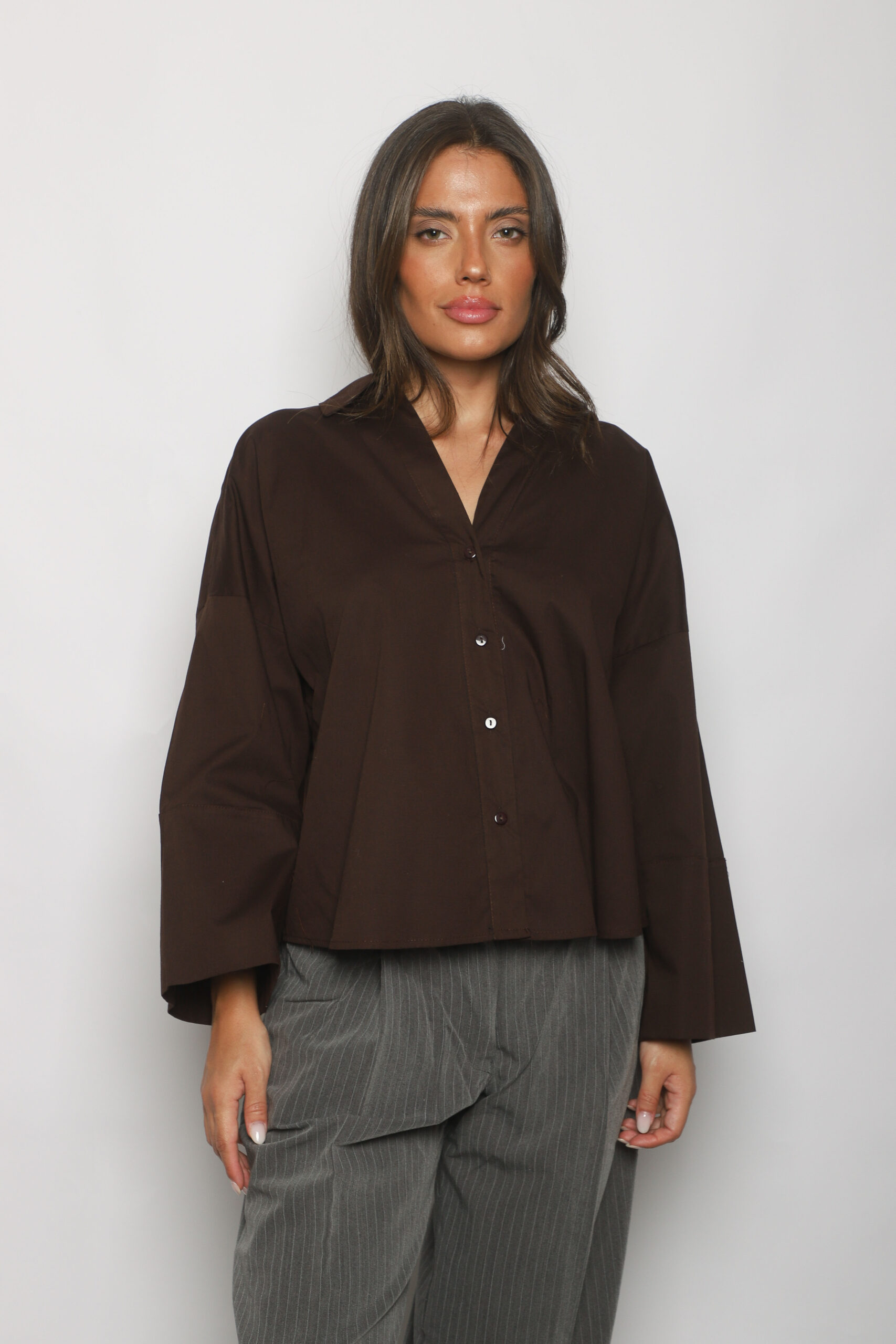 Descripci贸n: Camisa oversized con corte a la cadera y escote en V, tiene mangas anchas y detalle en la espalda de una tabla confeccionada para adentro en todo el largo y una tirita uniendo ambos lados.