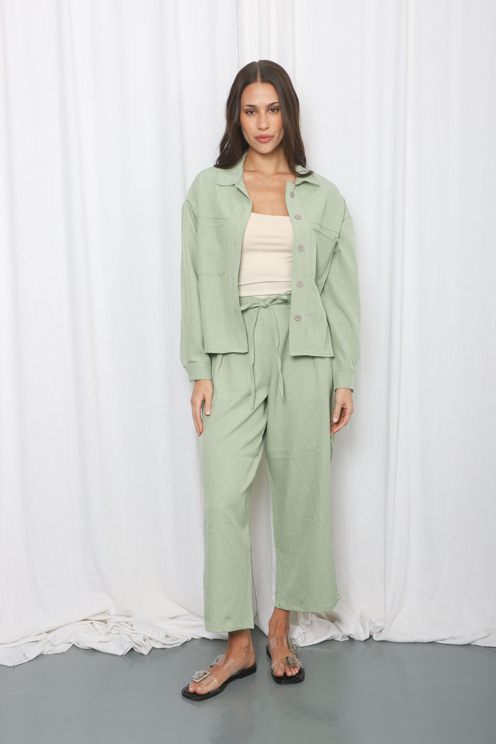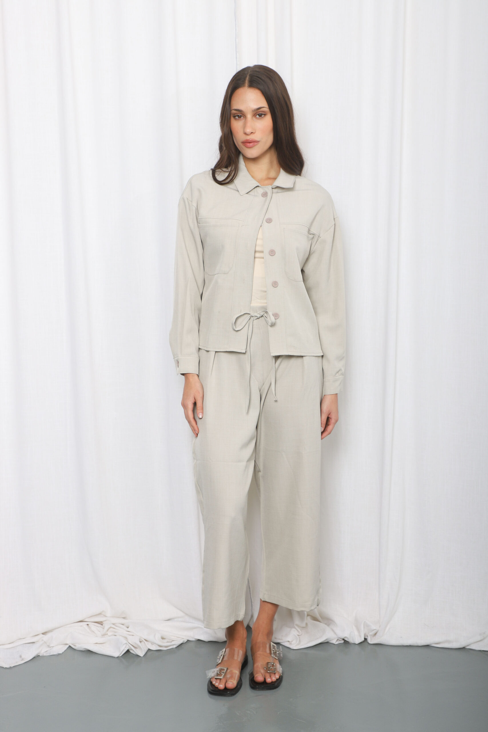 Descripción: Pantalón recto hasta el tobillo, de cintura alta, tiene una faja de elástico en la parte trasera y frente liso con dos cordones a tono. Tiene pinzas.