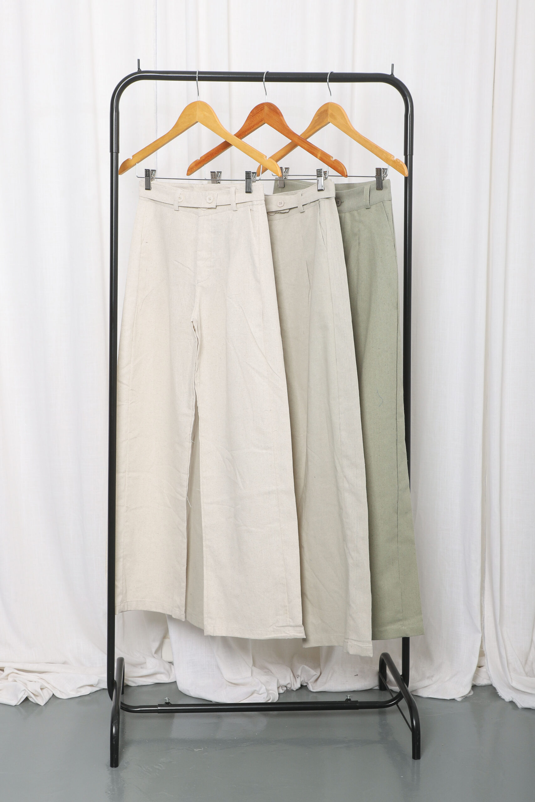 Descripción: Pantalón tipo wide leg de cintura alta, tiene un cinto desmontable a tono con doble ojal y botón para regular la posición. Contiene además, dos bolsillos laterales y pinzas.